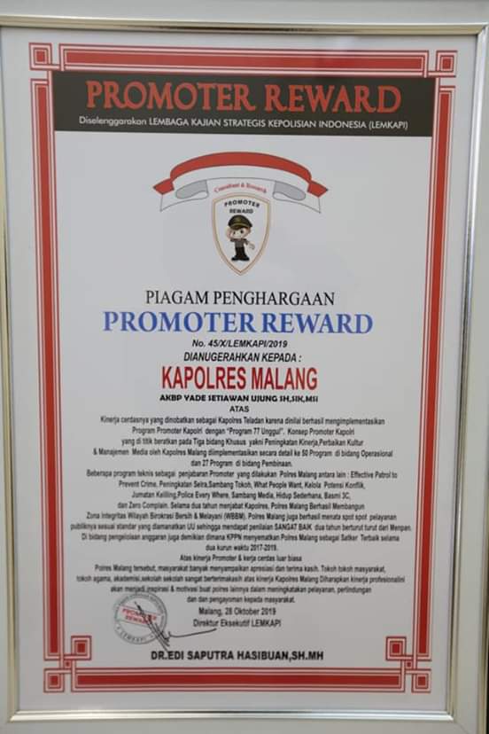 Kapolres Malang AKBP Yade Setiawan Ujung Mendapatkan Promoter Reward Sebagai KAPOLRES TELADAN dari Lemkapi. Penghargaan Tersebut Langsung Diserahkan Oleh Direktur Eksekutif Lemkapi (Lembaga Kajian Strategis Kepolisian Indonesia) DR. Edy Hasibuan,SH,MH di Mapolres Malang Pada Hari Senin 28 Oktober 2019 Bertepatan Dengan Peringatan Hari Sumpah Pemuda.