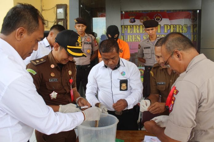 Pemusnahan barang bukti dilakukan dengan cara dilarutan di dalam ember yang berisi air dan telah dicampur dengan larutan pembersih lantai.