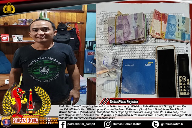 “Saat dilakukan penggeledahan barang bukti yang kita amankan, 1 (satu) buah hp merk Nokia warna hitam, 1 (satu) buah hp merk Oppo F.5 warna gold, uang tunai Rp.2.810.000 (dua juta delapan Ratus rupiah), 1 (satu) buah kertas grafik dan 1 (satu) buah buku tabungan Mandiri atas nama Hendro. Tersangka dan barang bukti kita bawa ke Polres Kotim guna sidik lebih lanjut, “pungkasnya. (asrory)