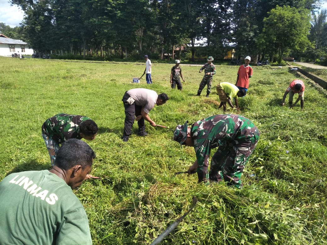 Satgas Pamtas Yonif R 142/KJ mengajak kurang lebih 30 orang warga dari seluruh lapisan masyarakat di Desa Maumutin, secara bersama-sama melaksanakan kegiatan gotong-royong membersihkan lingkungan di sekitar lapangan Desa Maumutin yang menjadi tempat pusat olahraga.