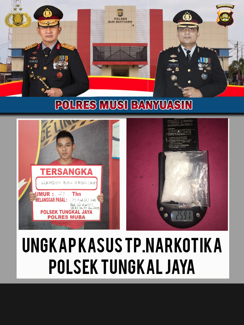 Jajaran Polsek Tungkal Jaya Resor Muba menangkap satu tersangka pengedar narkoba yang kerap beraksi di desa Peninggalan Kec. Tungkal Jaya, Jumat (12/06/2020) sekira pukul 17.30 wib.