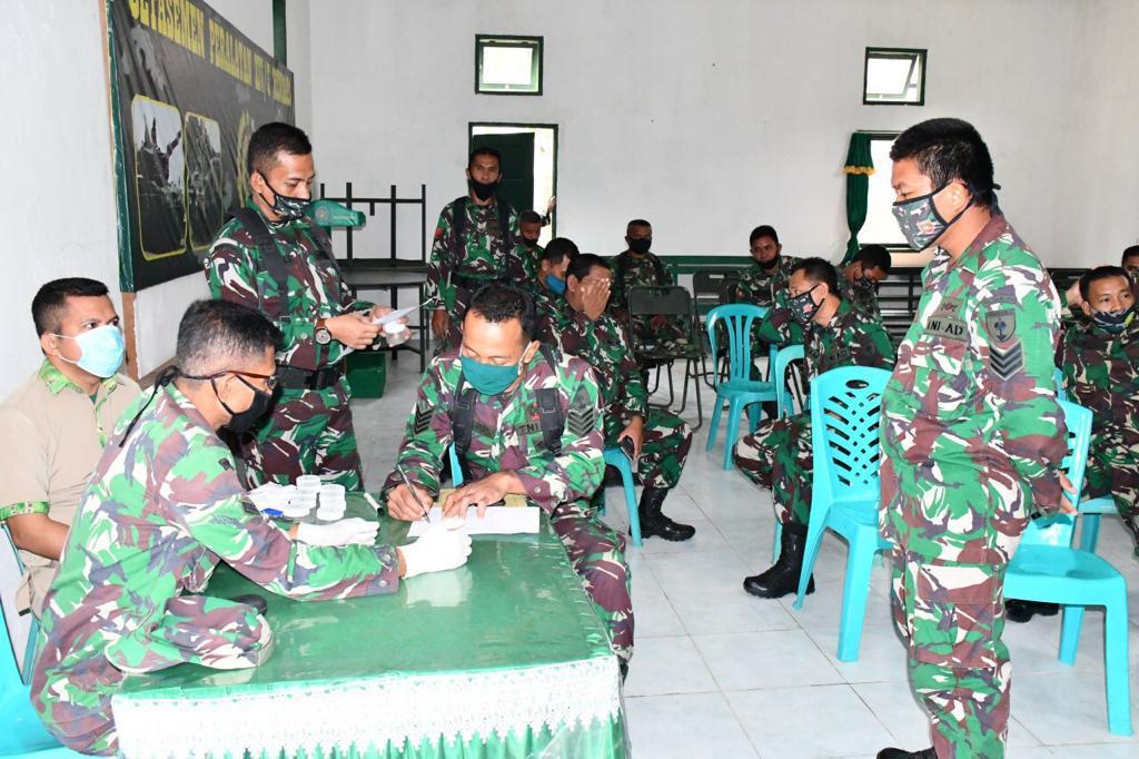 Tim Pencegahan Pemberantasan Penyalahgunaan Peredaran Gelap Narkoba (P4GN) Paldam XIV/Hasanuddin yang dipimpin oleh Kapten Cpl Leonardus bersama tim penyuluh dari Denkesyah Kendari melaksanakan penyuluhan Narkoba dan tes urine di Denpal XIV/3 Kendari, Kampung Salo, Kota Kendari, Kamis (30/7/2020).