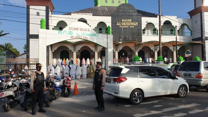 Puluhan Personel Polresta Palangka Raya diterjunkan untuk mengamankan jalannya pelaksanaan Ibadah Sholat Idul Adha 1441 H di beberapa Masjid Kota Palangka Raya Kalimantan Tengah, Jum’at (31/07/2020) pagi.