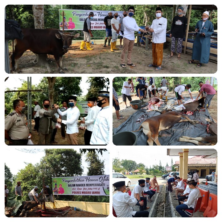 Dalam melaksanakan Qurban Kapolres Muaro Jambi AKBP Ardiyanto SIK MH bersama keluarga menyerahkan Satu ekor sapi Qurban , serta Wakapolres Muaro Jambi ,para Kasat dan Kapolsek serta PT Pelindo Jambi menyumbangkan satu ekor sapi , juga Bupati Muaro Jambi Hj Masnah Busro satu ekor sapi diserahkan ke Polres Muaro , rencana akan dilaksanakan pemotongan nya di Pulau Kayu Ari Kacamatan Sekernan Kabupaten Muaro Jambi.