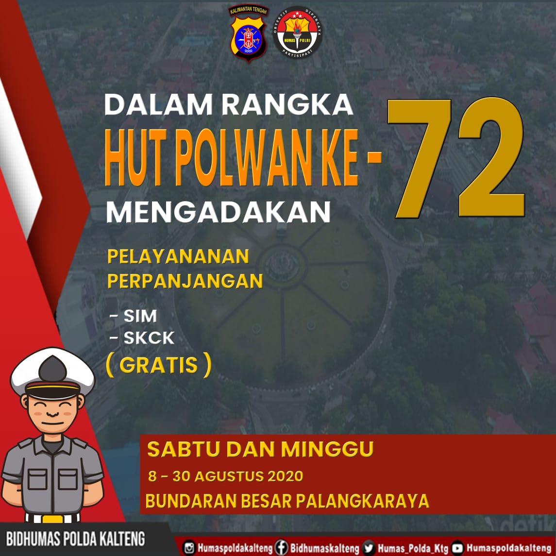 Menjelang perayaan Hut Polwan Ke – 72, Polda Kalteng melaksananakan pelayanan perpanjangan SIM dan SKCK secara gratis yang bertempat di Bundaran Besar Kota Palangka Raya setiap hari sabtu dan minggu mulai tanggal 08 sampai dengan 30 Agustus 2020.