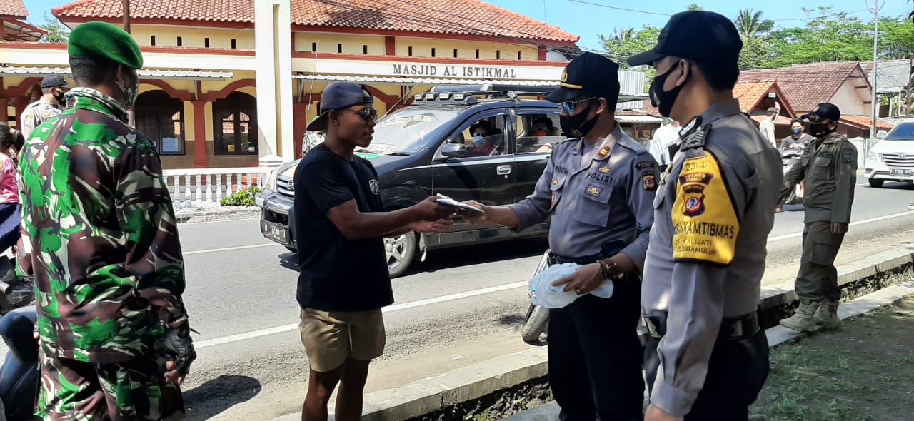 Jajaran Kepolisian Sektor Sidamulih Polres Ciamis Polda Jabar melaksanakan kegiatan pembagian masker gratis kepada warga masyarakat disekitar Jalan Cikembulan dan Pasar Cikembulan, Kecamatan Sidamulih, Kabupaten Pangandaran, Jawa Barat, Sabtu (12 September 2020).