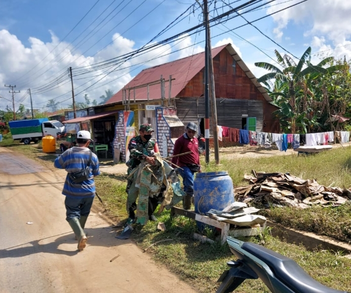 Untuk itu Babinsa Koramil 0910-03/Malinau Kota, Kodim 0910/Malinau Sertu Safriansyah bersama masyarakat bergotong royong membersihkan material sampah dan lumpur di Desa Malinau Hulu, Kecamatan Malinau Kota, Kabupaten Malinau, Kalimantan Utara, Rabu (19/05/2021).