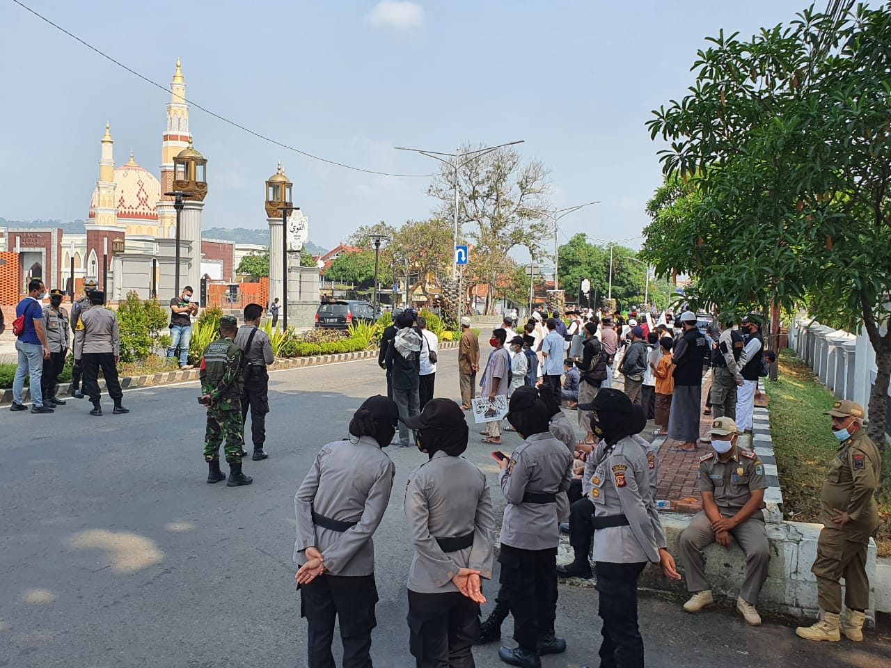 Puluhan personel Kepolisian Resor Majalengka Polda Jabar melaksanakan pengamanan aksi Solidaritas Bela Palestina di depan halaman gedung DPRD Kabupaten Majalengka, Minggu siang (23/5/2021).