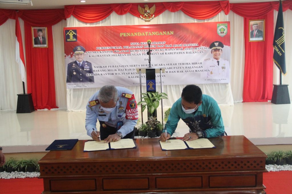 Senin (31/05), Kantor Wilayah Kementerian Hukum dan Hak Asasi Manusia Kalimantan Selatan menerima sertifikat tanah atas hibah lahan dari pemerintah daerah Kabupaten Balangan. Hibah sertifikat tanah ini diberikan langsung oleh Bupati Balangan, H. Abdul Hadi dan diterima oleh Kepala Kanwil Kemenkumham Kalsel, Tejo Harwanto. Penyerahan hibah ini dilaksanakan di Aula Kanwil Kemenkumham Kalsel.