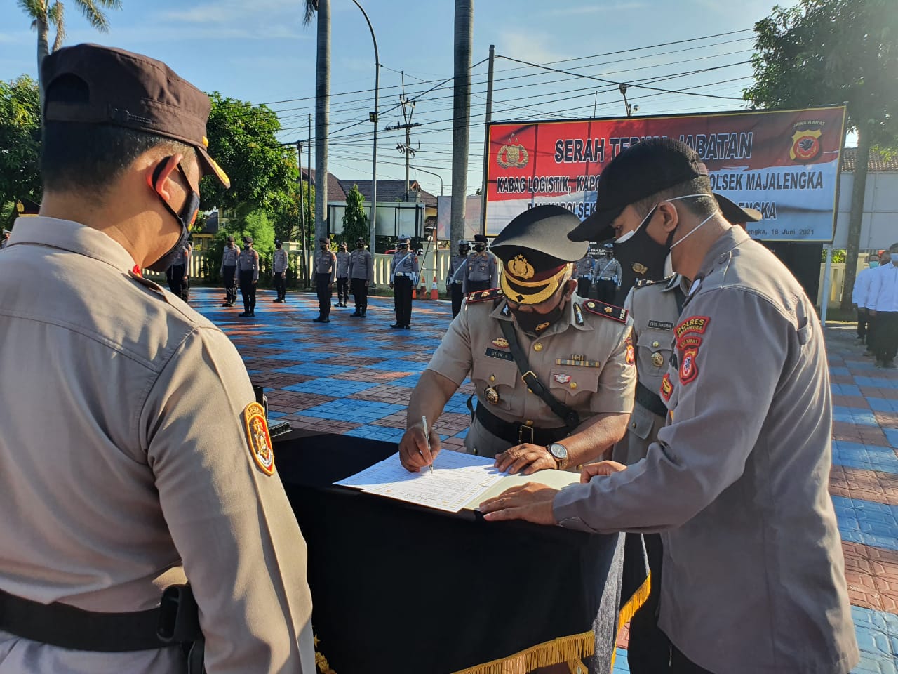 Kapolres Majalengka AKBP Syamsul Huda memimpin acara serah terima jabatan Kabag Logistik dan 3 (tiga) Kapolsek Jajaran Polres Majalengka, di halaman lapangan Mapolres Majalengka, Jumat (19/6/2021).