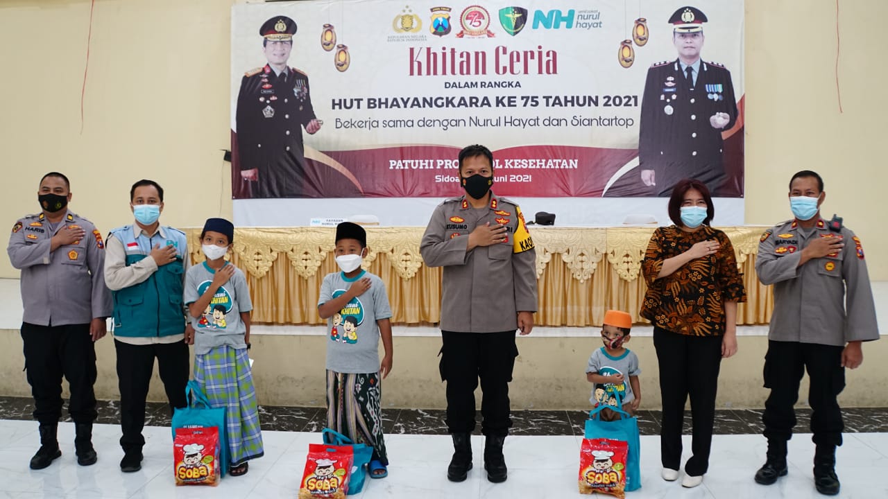 Memperingati Hari Bhayangkara ke-75 pada 1 Juli 2021, Polresta Sidoarjo mengadakan khitan massal ceria sebanyak 125 anak secara gratis, bertempat di Gedung Serbaguna Polresta Sidoarjo, Sabtu (19/6/2021).