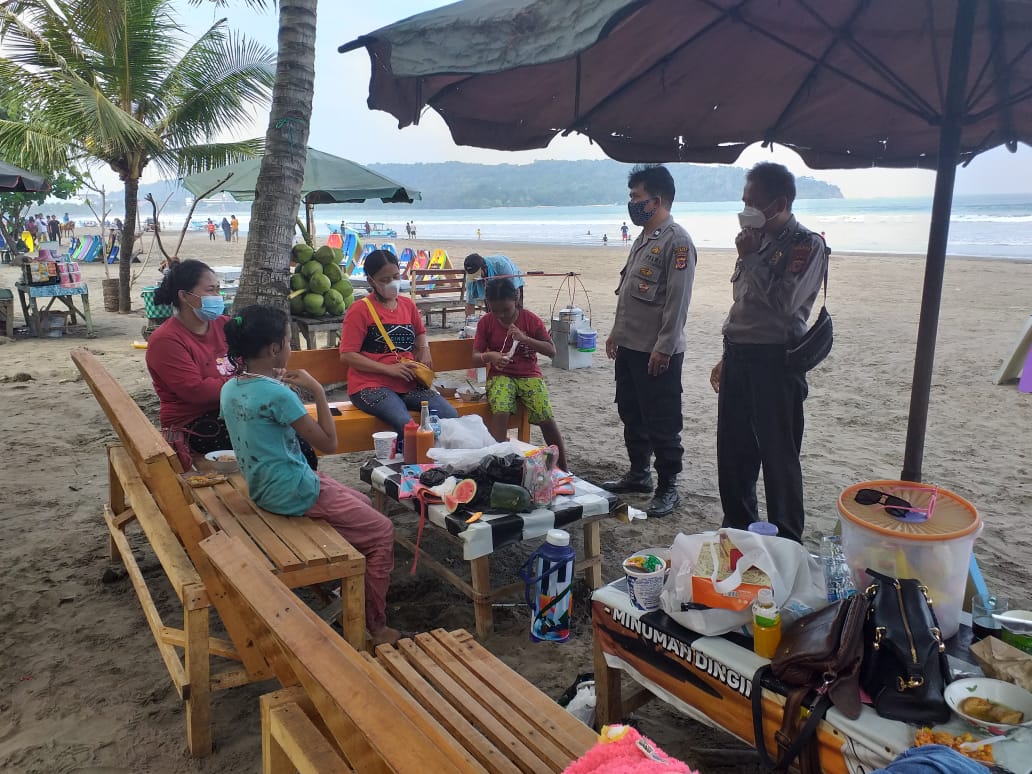 Kepolisian Sektor Pangandaran Polres Ciamis Polda Jabar melaksanakan kegiatan edukasi pencegahan Covid-19 berupa himbauan pendisiplinan Protokol Kesehatan terhadap wisatawan di kawasan obyek wisata Pantai Barat Pangandaran, Kabupaten Pangandaran, Jawa Barat, Minggu (20 Juni 2021).