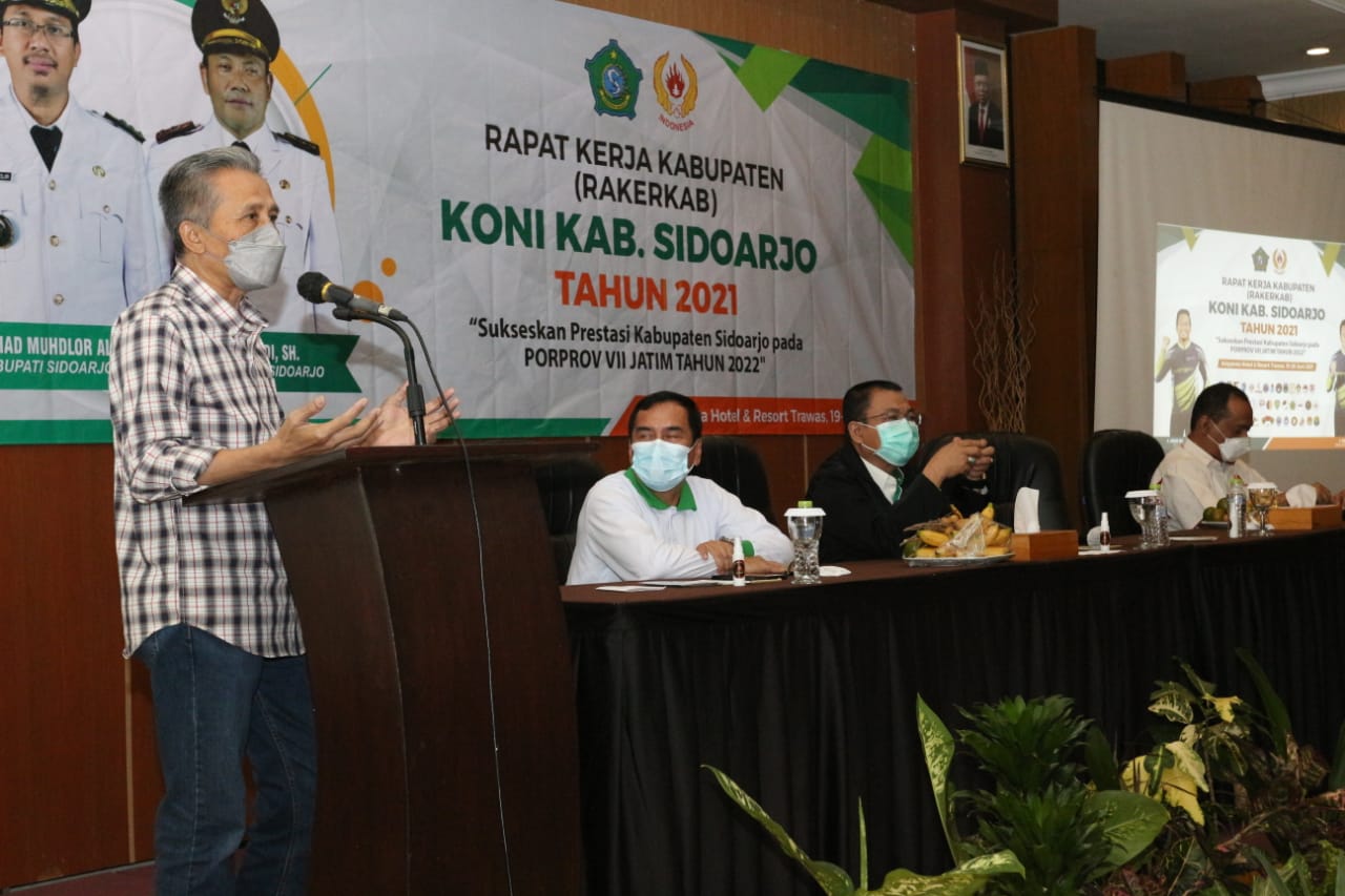 Sekda Sidoarjo Drs. Ahmad Zaini MM membuka Rakerkab (Raker Kerja Kabupaten) KONI Kabupaten Sidoarjo yang digelar di Hotel Arayanna Trawas Mojokerto, Sabtu, (19/6). Dalam sambutannya mewakili Bupati Sidoarjo H. Ahmad Muhdlor Ali S.IP, Sekda Sidoarjo Ahmad Zaini meminta ada bahasan program bagi masa depan atlet selepas tidak lagi berprestasi. Selain itu pembinaan diluar keolahragaan bagi atlet juga diharapkan menjadi masukan dalam bahasan program Rakerkab tahun ini.