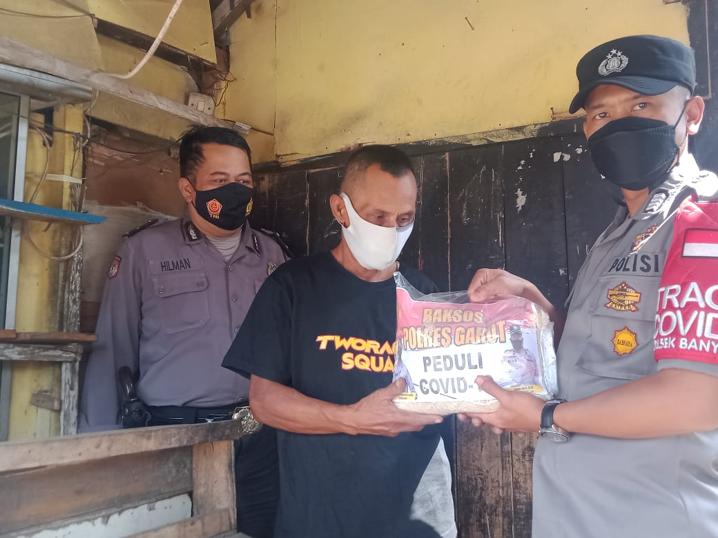 Jajaran Kepolisian Sektor Banyuresmi, Polres Garut, kembali menggelar bakti sosial dengan membagikan paket sembako secara door to door kepada 2 warga kurang mampu dan yang terdampak PPKM Darurat di Wilayah Kecamatan Banyuresmi, Kabupaten Garut, Provinsi Jawa Barat, Jumat (23/7/2021).