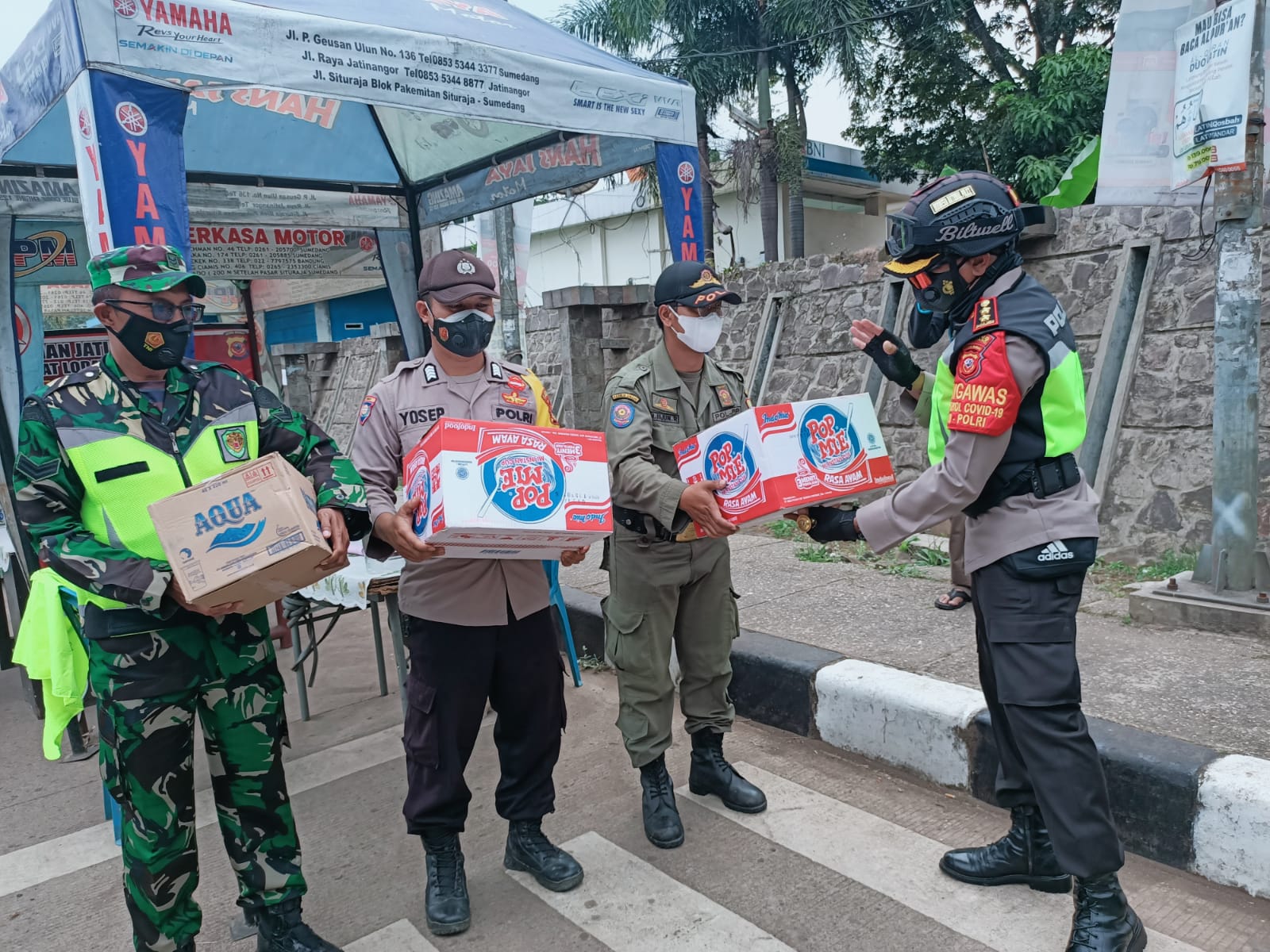Kapolres mengingatkan kepada anggota yang melaksanakan tugas di Pos Penyekatan, di Pos Penyekatan tetap setiap orang atau kendaraan yang masuk ke wilayah Sumedang agar diperiksa, selain itu di sela-sela pengecekan Kapolres memberikan makanan dan minuman kepada anggota yang melaksanakan tugas di Pos Penyekatan, Sabtu (24/7/2021).