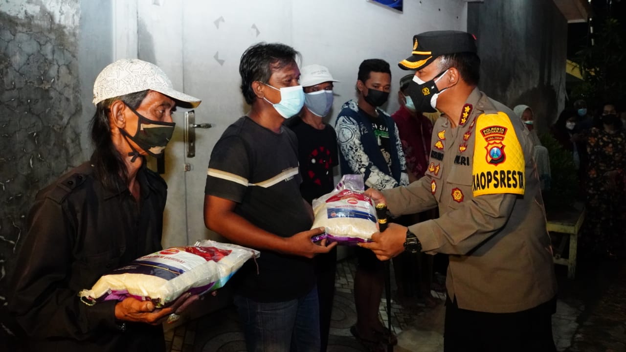 Di tengah patroli Pemberlakuan Pembatasan Kegiatan Masyarakat (PPKM) level 4 di wilayah Kabupaten Sidoarjo, termasuk mengecek sejumlah pos penyekatan pembatasan mobilitas, Sabtu (24/7/2021) malam, Kapolresta Sidoarjo Kombes Pol. Kusumo Wahyu Bintoro membagikan bantuan sosial paket sembako kepada masyarakat terdampak Pandemi Covid-19.