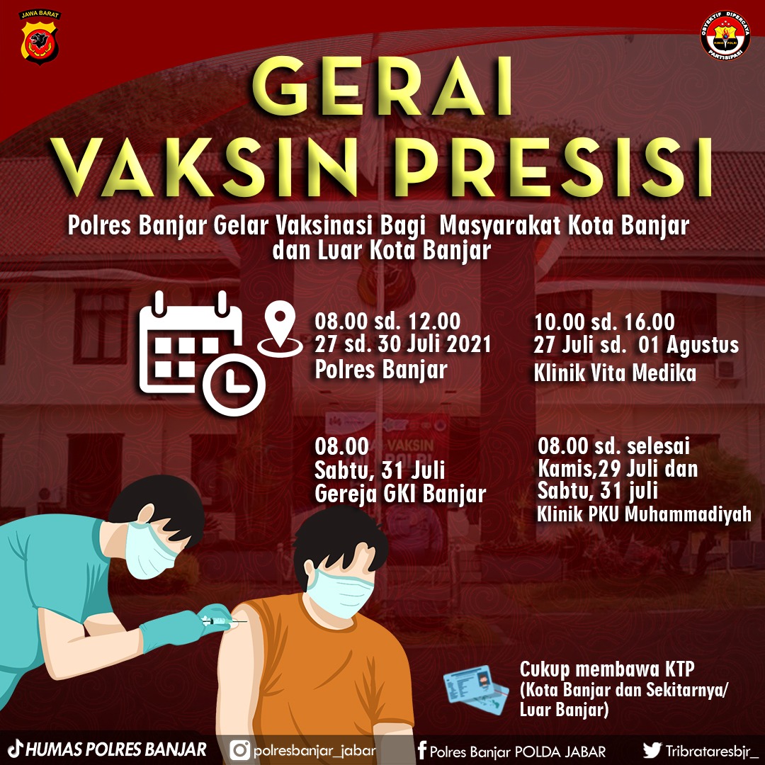 Adapun Jadwal Pelaksanaan Vaksinasi di lokasi tersebut yaitu di Mapolres Banjar mulai hari Selasa tanggal 27 Juli 2021 sampai dengan hari Jumat tanggal 30 Juli 2021 jam 08.00 sampai dengan 12.00 Wib, sedangkan di Klinik Vita Medika mulai hari Selasa sampai dengan Minggu jam 10.00 sampai dengan 16.00 Wib , sedangkan di PKU Muhammadiyah hari Selasa, Kamis, dan Sabtu jam 08.00 sampai selesai, dan di Gereja GKI Kota Banjar hari Sabtu mulai jam 08.00 Wib sampai selesai.