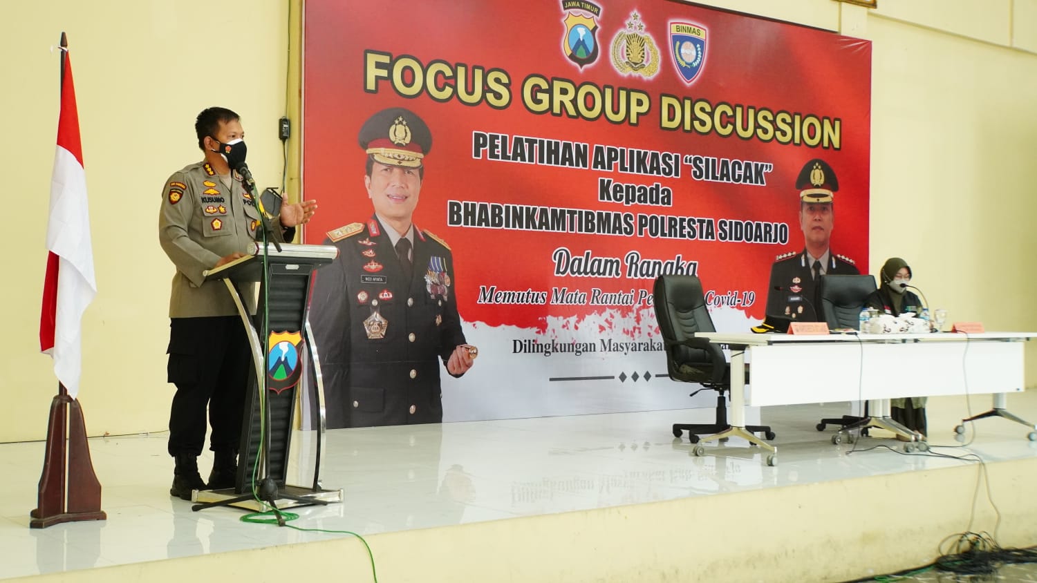 Polresta Sidoarjo bersama Dinas Kesehatan Kabupaten Sidoarjo berikan pelatihan Aplikasi Silacak kepada 347 bhabinkamtibmas yang ada di Kabupaten Sidoarjo, Rabu (28/7/2021) di Gedung Serbaguna Polresta Sidoarjo.