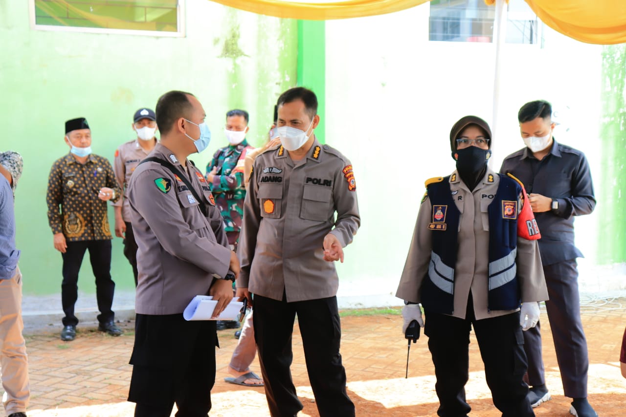 Kapolres Ciamis AKBP Wahyu Broto Narsono Adhi, S.I.K., M.Sc.Eng., mendampingi Kabid Dokkes Polda Jabar Kombes Pol. dr. Adang Azhar monitoring pelaksanaan vaksinasi untuk anak usia 12-17 tahun dan lansia di sebuah Pondok Pesantren di Kabupaten Ciamis, Kamis (29 Juli 2021).