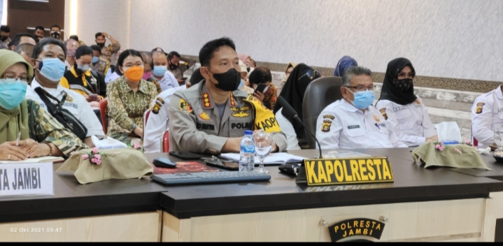 Kapolresta Jambi menyampaikan ” kegiatan hari ini kita melaksanakan zoom meeting bersama Kapolda Jambi dalam rangka percepatan penanganan Covid 19 di Kota Jambi, dan diikuti dari Dinas Kesehatan , pihak Puskesmas Sekota Jambi para Bhabinkamtibmas dan Pokdar Kamtibmas .