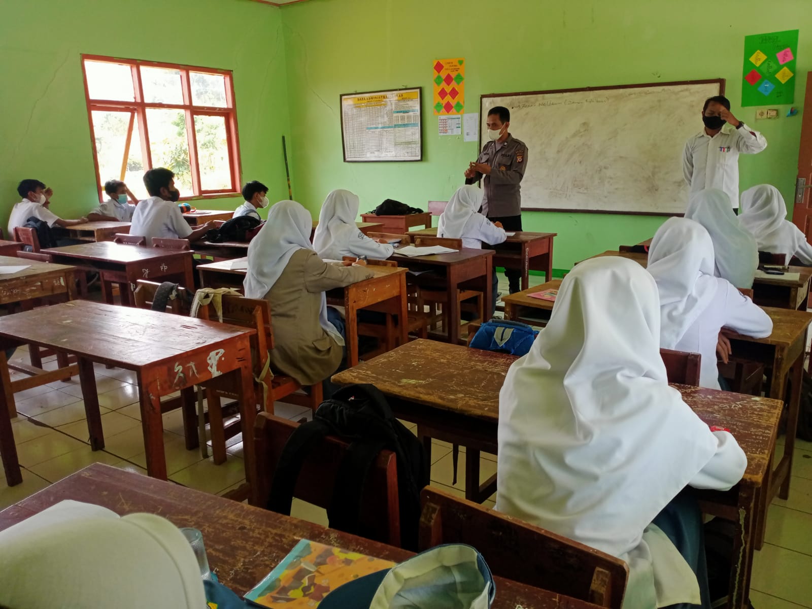 Kanit Bintibsos menyambangi MA Al Hadad didampingi Kanit Binmas Polsek Malausma Bripka Ence memeriksa kelengkapan sarana dan prasarana pendukung penerapan protokol kesehatan mulai dari ketersediaan air pada fasilitas cuci tangan, penggunaan masker sampai jarak tempat duduk di dalam kelas.