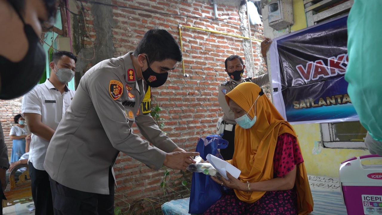 Kapolresta Mojokerto AKBP Rofiq Ripto Himawan, S.I.K., S.H., M.H. didampingi pejabat utama dan vaksinator menggunakan motor vaksin keliling dalam rangka melaksanakan Vaksin Door To Door kepada 32 lansia di Kota Mojokerto sekaligus memberikan bantuan sosial berupa paket Sembako dan Vitamin serta obat-obatan. Jumat(08/10/21) Sore.