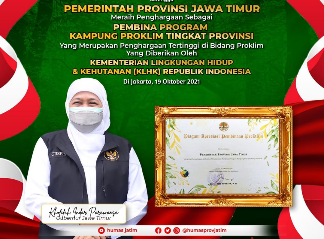 Pemerintah Provinsi Jawa Timur, kembali berhasil meraih penghargaan terbaik sebagai Pembina Program Kampung Proklim Tingkat Provinsi dari Kementerian Lingkungan Hidup dan Kehutanan (KLHK) di Jakarta, Selasa (19/10/2021).