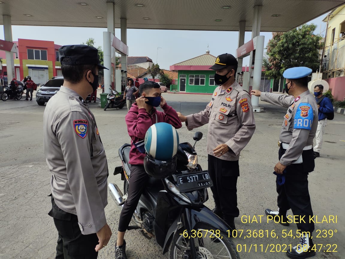 Kepolisian Sektor Klari Polres Karawang di bawah pimpinan Kompol Ricky Adipratama S.H, S.I.K, M.M Menggelar kegiatan Stationer Operasi Yustisi terkait penegakan disiplin protokol kesehatan serta sosialisasi PPKM level 2 di wilkum polsek klari,” Senin (01/11/21) pukul 08:45 wib sampai selesai