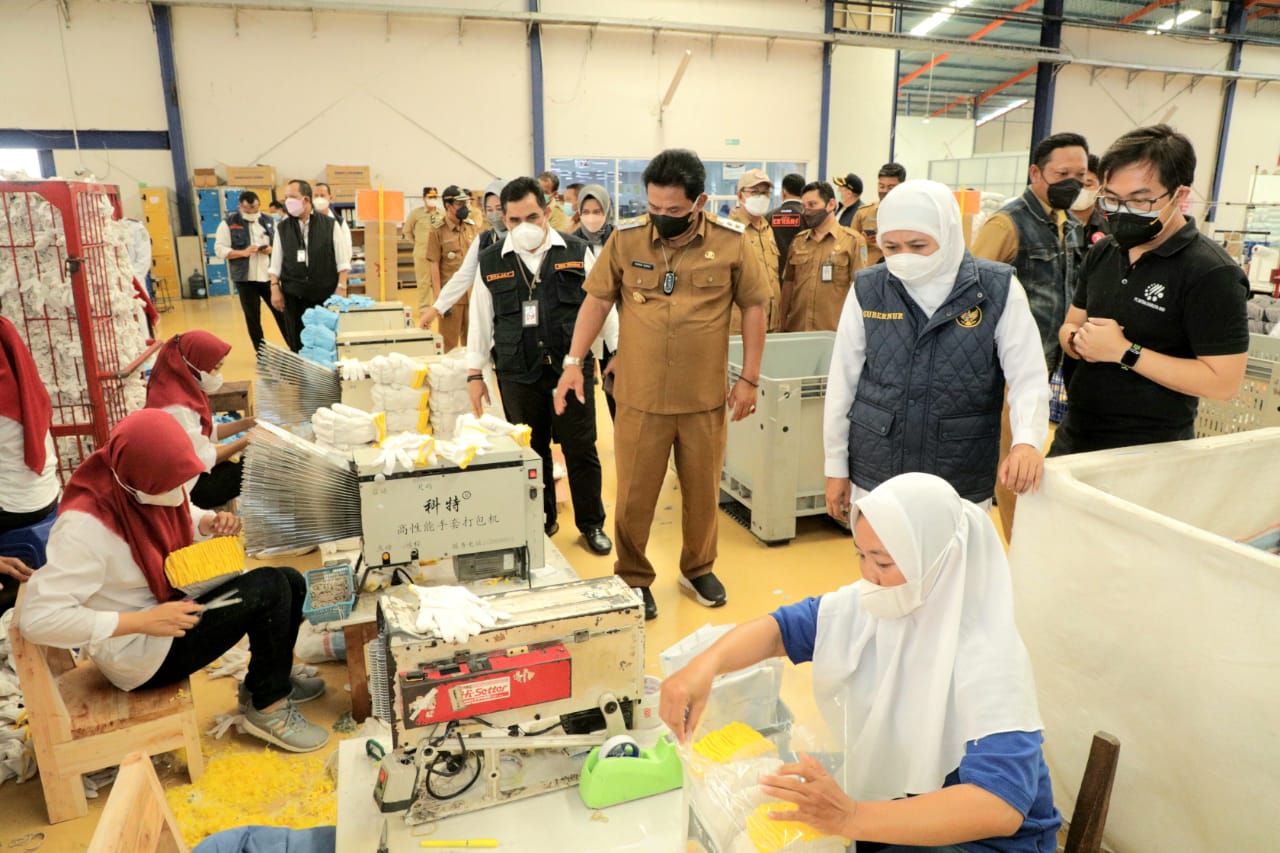Gubernur Jawa Timur Khofifah Indar Parawansa memberikan apresiasi perusahaan-perusahaan di Kawasan Industri Nganjuk yang mampu eksis bertahan ditengah pandemi Covid-19. Bahkan tidak sedikit perusahaan yang menurut Khofifah justru menggenjot produktivitasnya. Salah satunya, pabrik sarung tangan yang berada di KING Rejoso.