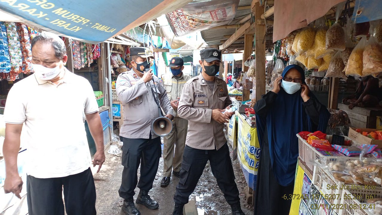 personil menyasar Pasar Tradisional Jatisari Desa Mekarsari Kec. Jatisari dan sekitarnya dengan menghimbau warga Pengunjung pasar dan menjumpai warga yang berkerumun serta pemilik Kios dan warung agar mematuhi protokol kesehatan mulai dari penggunaan masker.