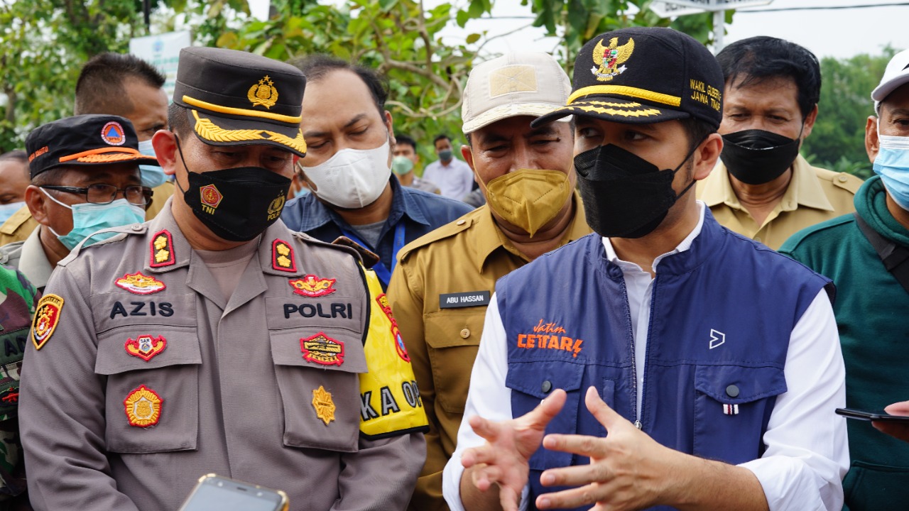 Wakil Gubernur Jawa Timur, Emil Elestianto Dardak bersama rombongan meninjau tanggul jebol yang berada di desa Cermen, Kecamatan Kedamean, Kabupaten Gresik. Tanggul Jebol itu berada di depan Balai Desa Cermen.Senin(08-11-2021)