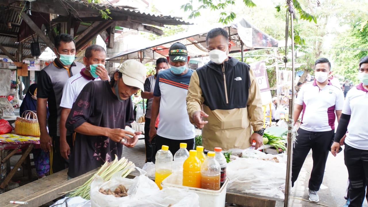 Sambil berjalan dan menyapa warga memberikan himbauan agar tetap jaga jarak dan memakai masker, Kapolresta Sidoarjo bersama anggotanya membagikan masker juga membeli dagangan yang ditawarkan para pedagang di Pasar Sono, Buduran.