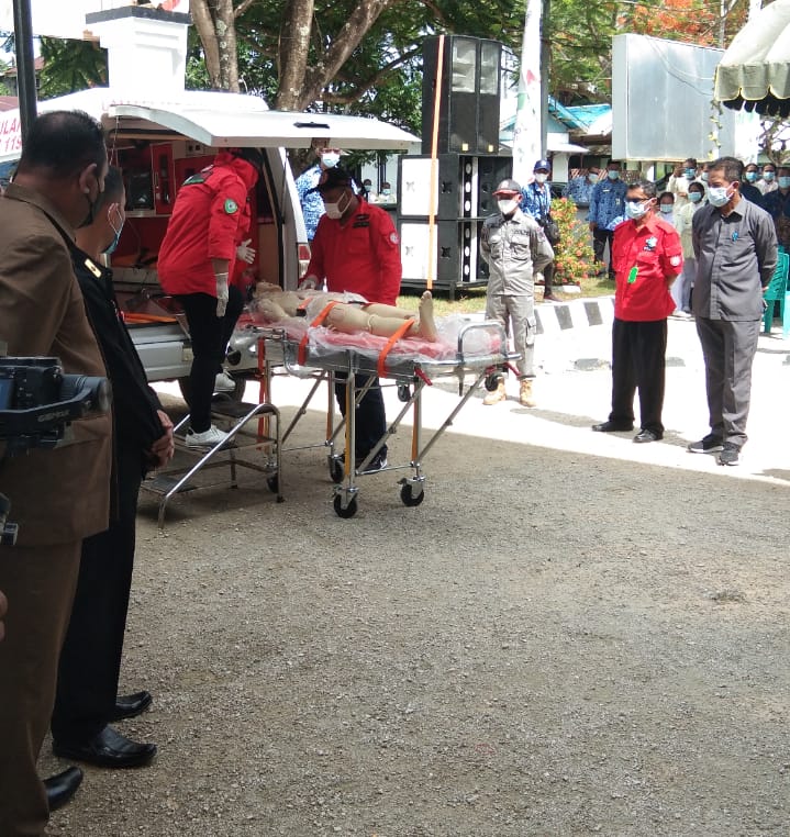 Usai penyerahan, Bupati yang di dampingi Forkopimda untuk menyaksikan langsung bagemana cara simulais penanganan dan penanggulangan korban dengan reaksi cepat (CTS).