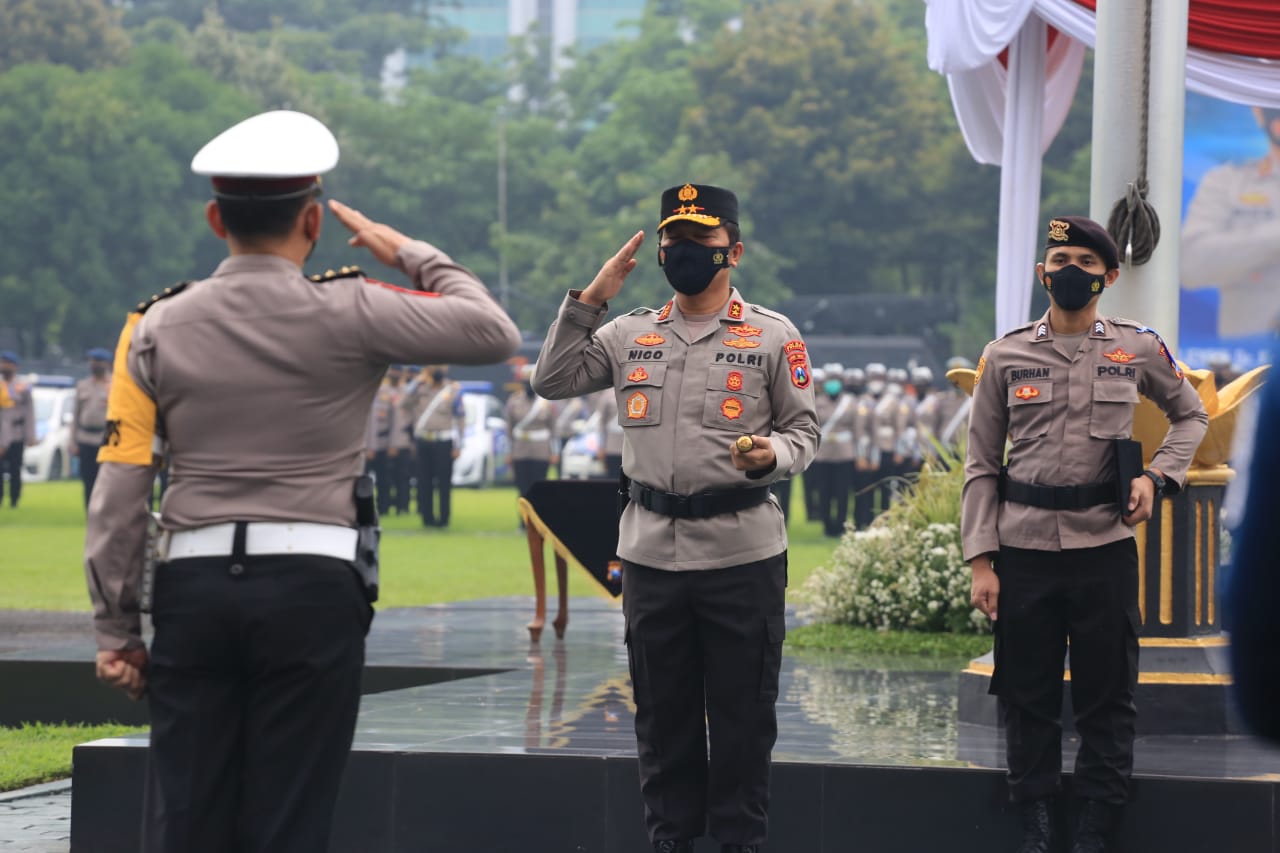 Kapolda Jawa Timur Irjen Pol Nico Afinta, didampingi Wakapolda Jatim Brigjen Pol Slamet Hadi Supraptoyo, beserta Pejabat Utama (PJU) Polda Jatim. Menggelar Apel Gelar Pasukan Ops Zebra Semeru 2021.