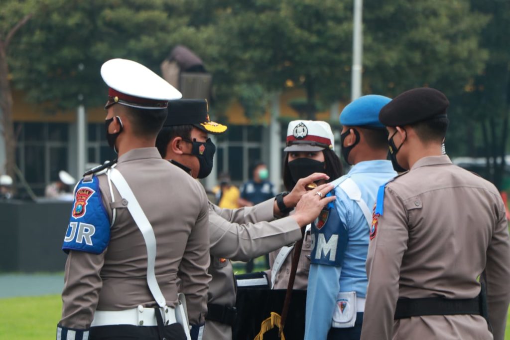Sebelum memberikan amanat, Kapolda jatim menyematkan pita tanda operasi kepada perwakilan dari anggota Polri, TNI dan Dishub.