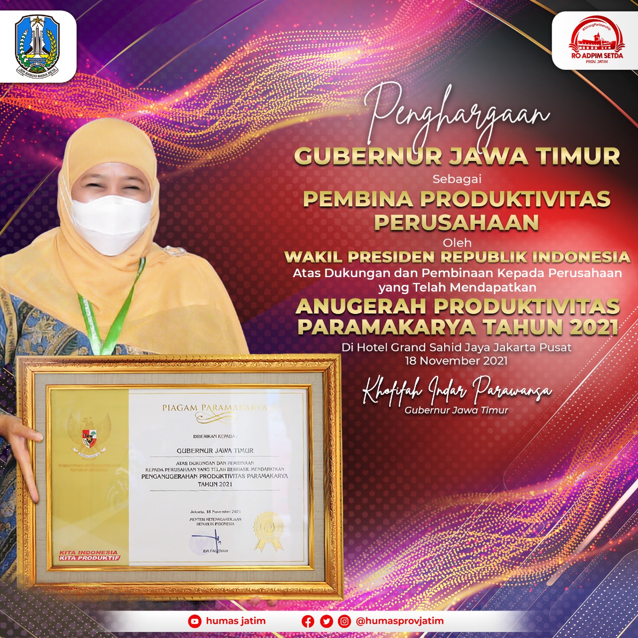 18 November 2021, Gubernur Jawa Timur Khofifah Indar Parawansa kembali menerima penghargaan sebagai Pembina Produktivitas Paramakarya. Tahun 2021 adalah kali kedua Gubernur Khofifah menerima penghargaan tersebut setelah di tahun 2019 menerima penghargaan yang sama. Penghargaan Paramakarya ini diberikan secara langsung oleh Wakil Presiden RI KH. Ma’ruf Amin kepada Gubernur Khofifah di Hotel Grand Sahid Jaya Jakarta Pusat pada Kamis (18/11).