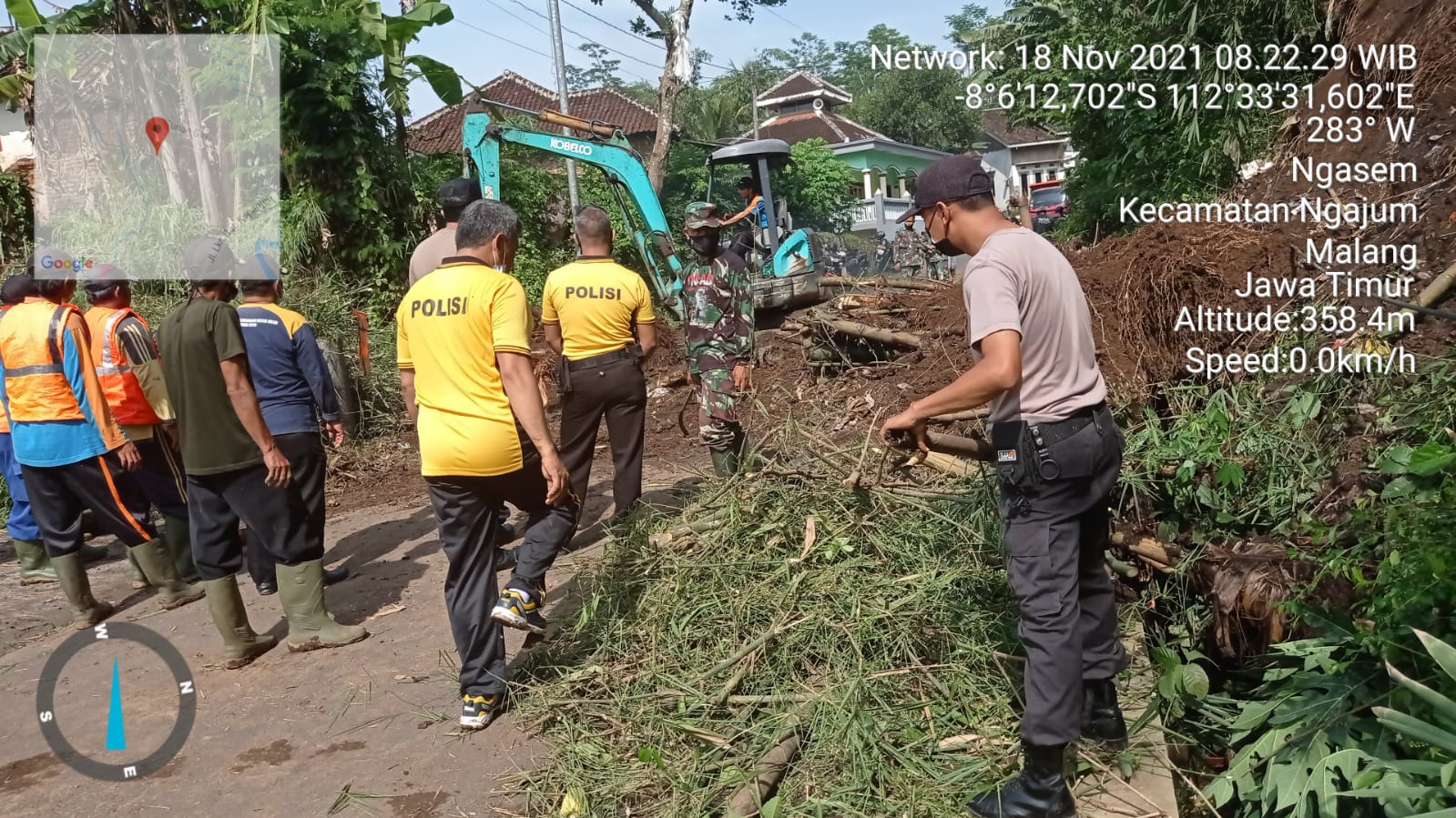 Kapolres Malang AKBP R. Bagoes Wibisono melalui Kapolsek Ngajum, Iptu Ronny Margas melaksanakan kerja bakti pembersihan material longsoran yang terjadi di Desa Ngasem, Kecamatan Ngajum, Kabupaten Malang. Rabu (17/11/2021) malam.