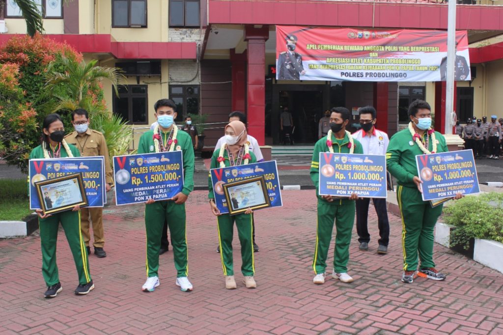 Kapolres Probolinggo AKBP Teuku Arsya Khadafi memberikan apresiasi berupa uang pembinaan dan piagam penghargaan kepada atlet yang memperoleh medali dalam ajang kejuaraan PON XX di Papua. Apresiasi diberikan baik kepada atlet maupun pelatih yang berprestasi sesuai dengan porsinya.
