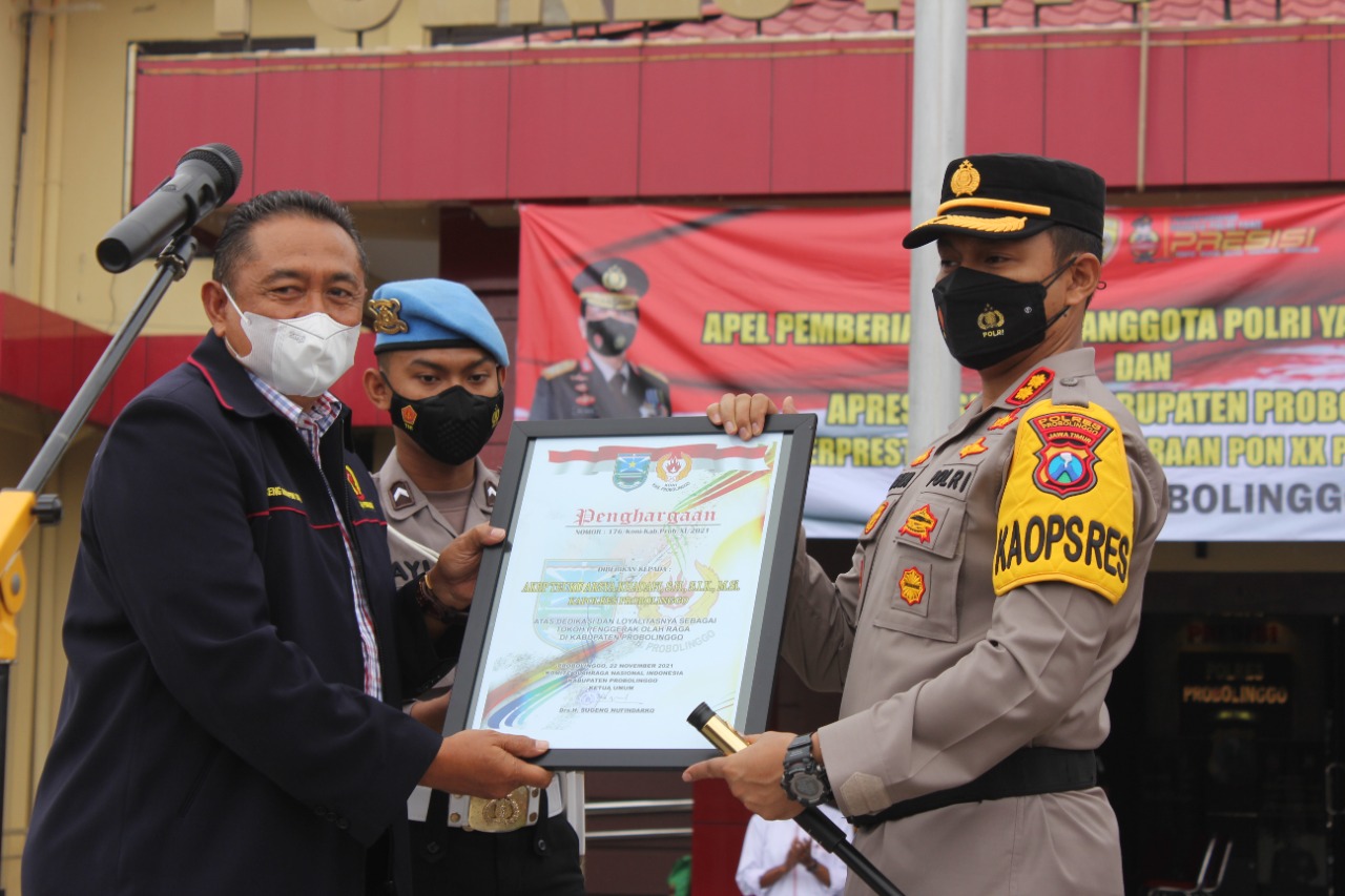 Kapolres Probolinggo apresiasi atlet berprestasi dari Kabupaten Probolinggo yang mewakili Provinsi Jawa Timur di ajang Pekan Olahraga Nasional (PON) XX tahun 2021 di Papua. Apresiasi dan penghargaan setinggi-tingginya diungkapkan Kapolres Probolinggo, AKBP Teuku Arsya Khadafi saat apel gelar pemberian reward kepada atlet berprestasi di Lapangan Mapolres Probolinggo, Senin (22/11/2021) pagi.