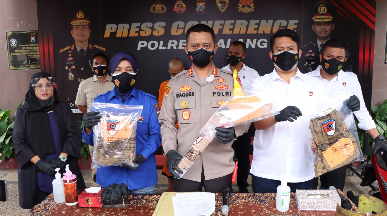 Kapolres Malang AKBP R. Bagoes Wibisono dengan didampingi Kasat Reskrim, AKP Donny K Bara’langi dan Kasihumas Polres Malang Iptu Daya Wastuti, gelar Press Converence terkait pengungkapan kasus dugaan pembunuhan di Desa Sindurejo Kecamatan Gedangan, Kabupaten Malang. Minggu (21/11/2021).