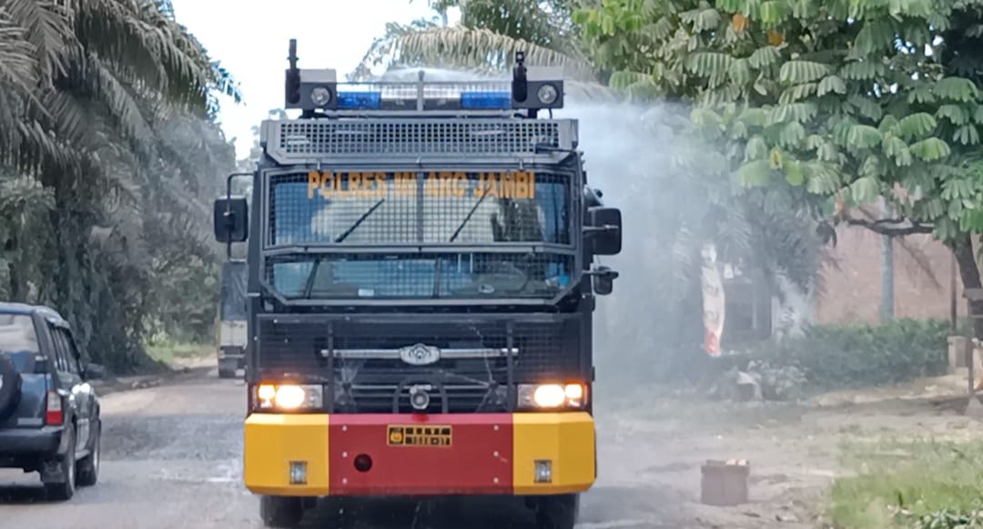 Polres Muaro Jambi mengkerahkan Mobil Water Cannon untuk melakukan penyiraman debu di Jalur II Batubara dan CPO Km 35 Tanjung Pauh, Kecamatan Mestong, Muaro Jambi, Rabu (1/12/2021).