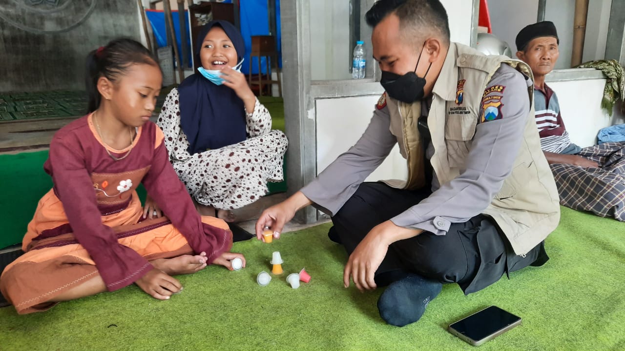 Ini adalah salah satu kominten Tim Trauma Healing Polres Malang dalam membantu psikologi korban bencana erupsi Gunung Semeru khususnya anak-anak.