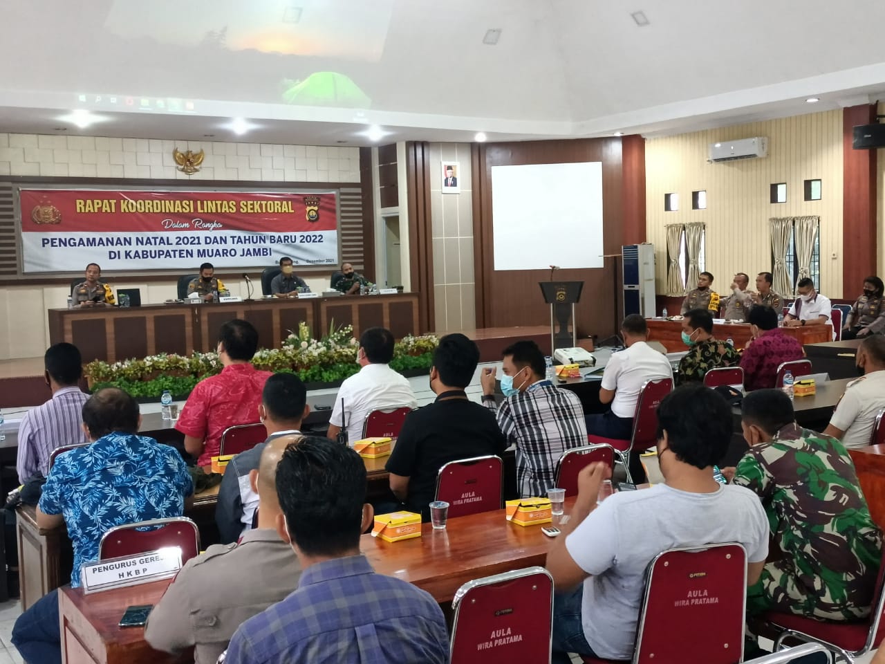 Kapolres Muaro Jambi AKBP Yuyan Priatmaja SIK MH memimpin langsung rapat koordinasi lintas sektoral dalam rangka pengamanan Natal dan tahun baru 2021-2022 yang dilaksanakan di Aula Wira Pratama Polres Muaro Jambi Sabtu18/12 pukul 09.00 wib.
