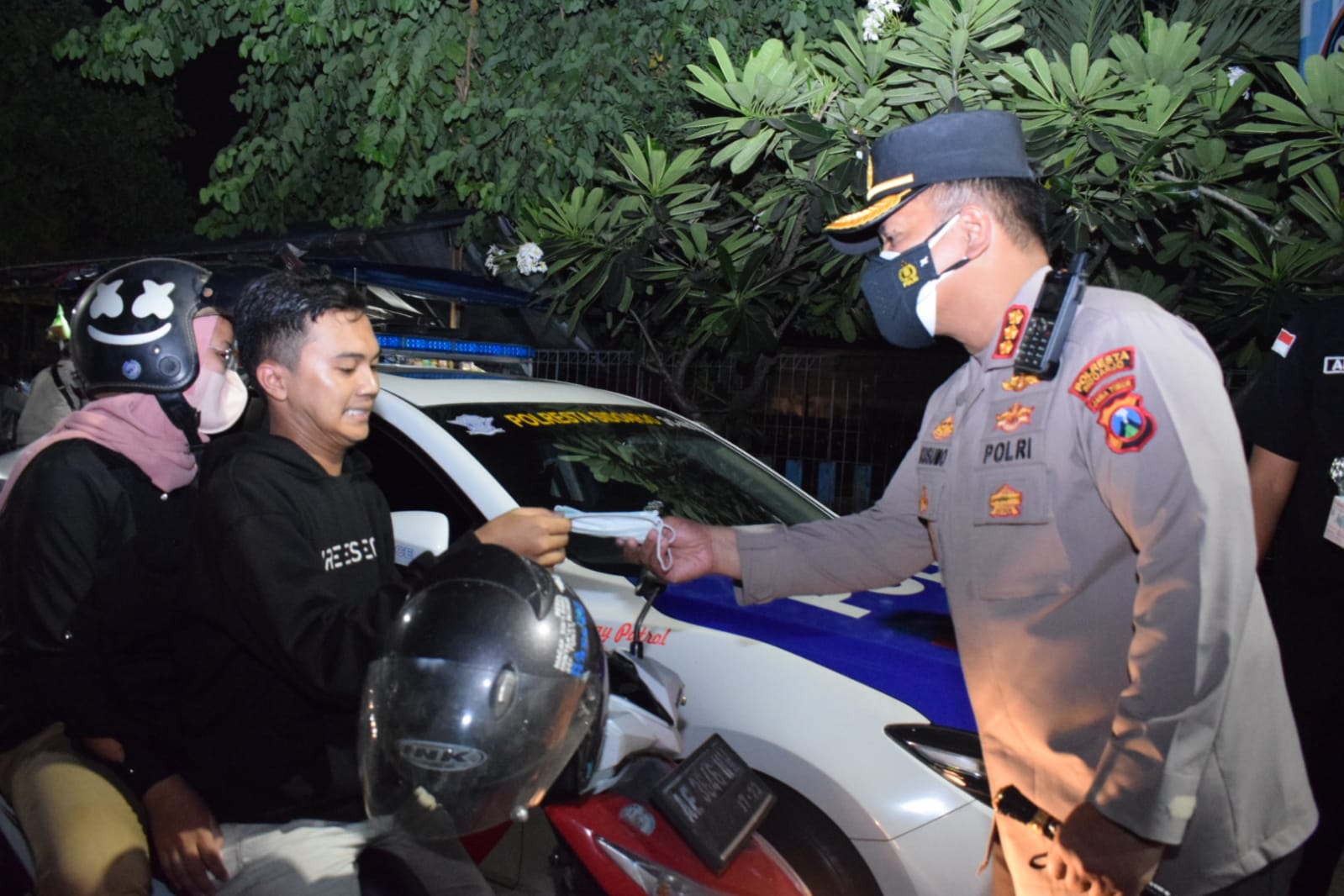 Edukasi protokol kesehatan dan tertib lalu lintas, seperti berlangsung di Pos Polisi P1, Waru, Sidoarjo, Sabtu (18/12/2021) malam. Ramainya pengendara yang melintas, menjadi sasaran sosialisasi humanis dari polisi.