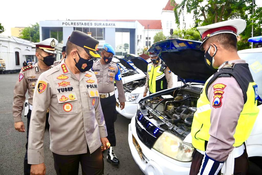 Kapolrestabes Surabaya Kombes Pol Achmad Yusep Gunawan melakukan pengecekan langsung pada selurh kendaraan operasional yang akan digunakan untuk pengamanan dan pelayanan masyarakat saat perayaan Natal dan Tahun Baru (Nataru).