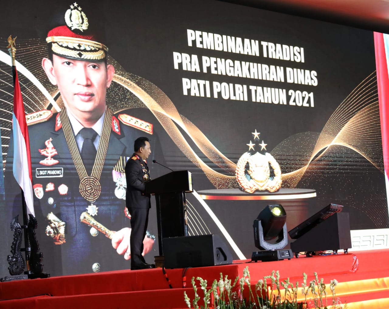 Kapolri Jenderal Listyo Sigit Prabowo menghadiri acara pembinaan tradisi pra-pengakhiran dinas Perwira Tinggi (Pati) Polri tahun 2021 di Auditorium PTIK, Jakarta Selatan, Selasa (21/12/2021).