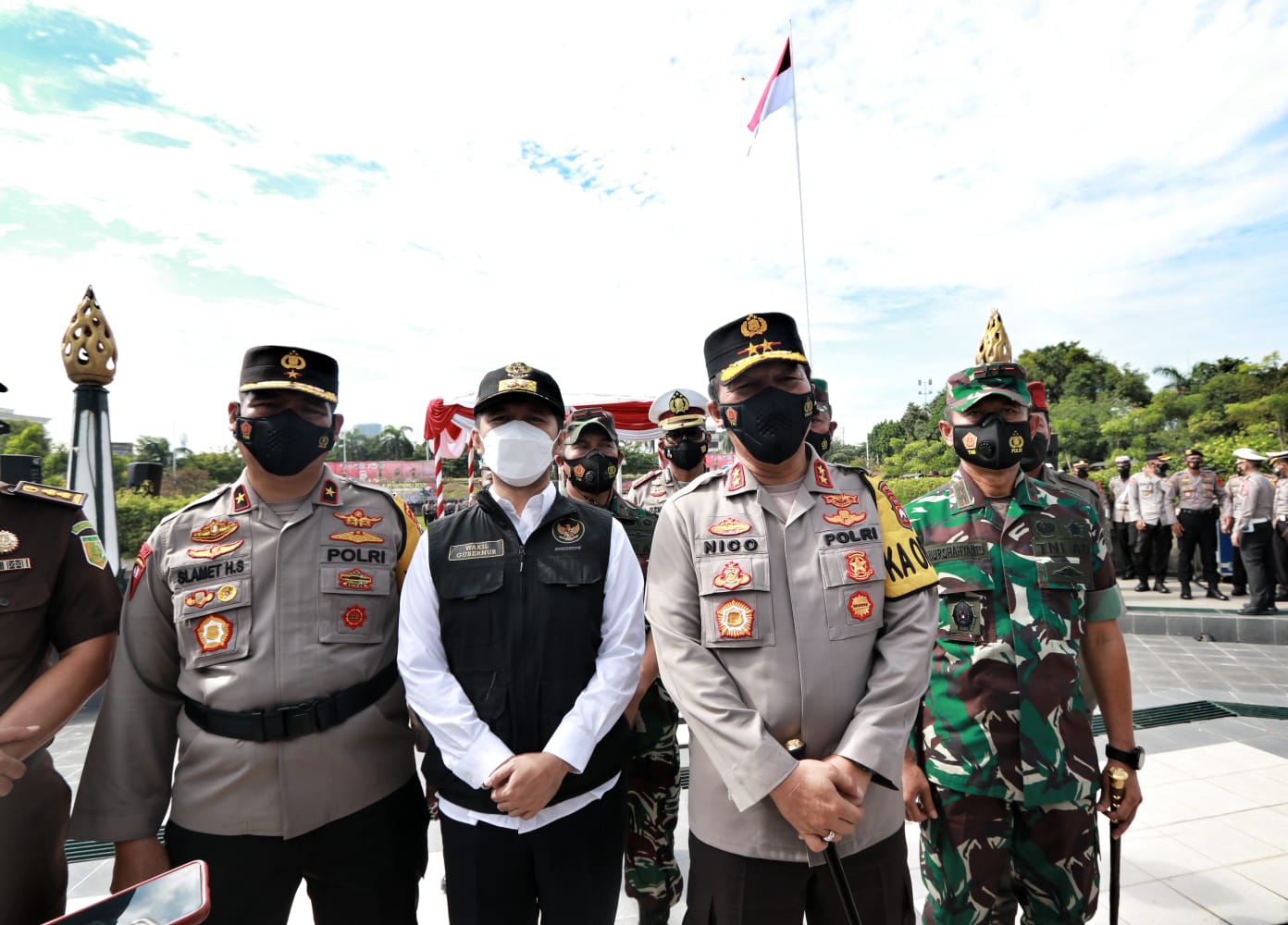 Forkopimda Jatim Gelar Apel Pasukan Operasi Lilin Semeru 2021, dalam rangka pengamanan jelang natal dan tahun baru (nataru) 2021-2022 yang digelar di Monumen Tugu Pahlawan, Surabaya, pada Kamis (23/12/2021) pagi.