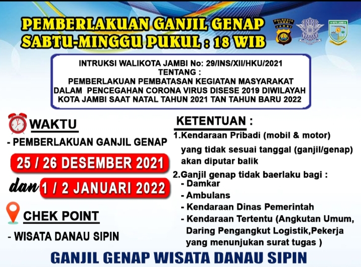 Kapolresta Jambi Kombes Pol Eko Wahyudi SIK MH melalui Kasat Lantas AKP Aulia Rahmad menyampaikan ” mulai tertanggal 25-26 Desember 2021 saat Perayaan Natal dan tanggal 1-2 Januari 2022 perayaan Tahun Baru , Polresta Jambi berlakukan sistem ganjil genap dikota Jambi dengan menurunkan 425 personel Polresta Jambi