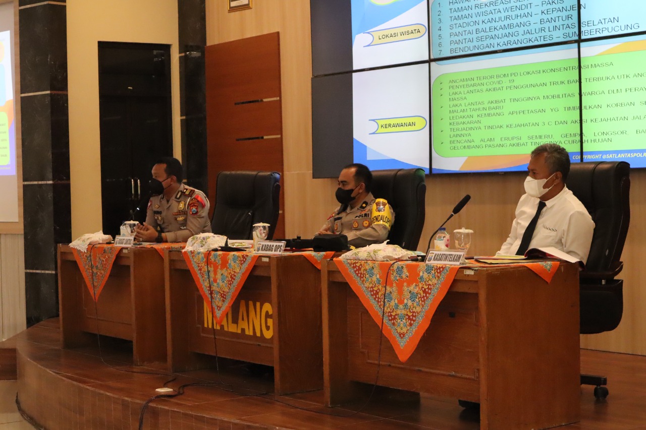Kapolres Malang AKBP Bagoes Wibisono melalui Kepala Bagian Operasional (Kabag Ops) Kompol I Made Prawira Wibawa memimpin Latihan Pra Operasi Lilin Semeru 2021 di Gedung Sanika Satyawada, Polres Malang, Kamis (23/12/21).