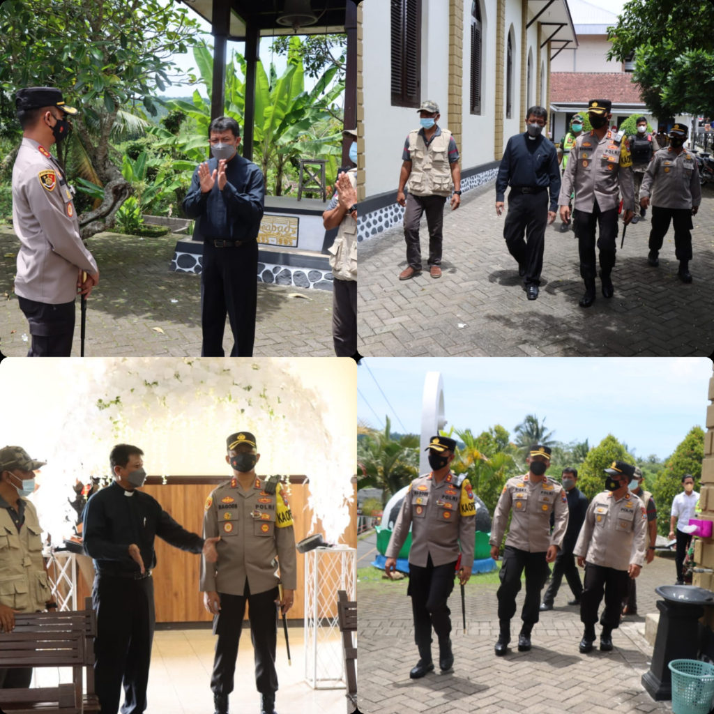 Kapolres Malang AKBP Bagoes Wibisono bersama Pejabat Utama Polres Malang melakukan kunjungan di beberapa gereja yang masuk wilayah hukum Polres Malang, Sabtu (2512/21). Kunjungan tersebut dilakukan dalam rangka melihat langsung jalannya ibadah hari natal.